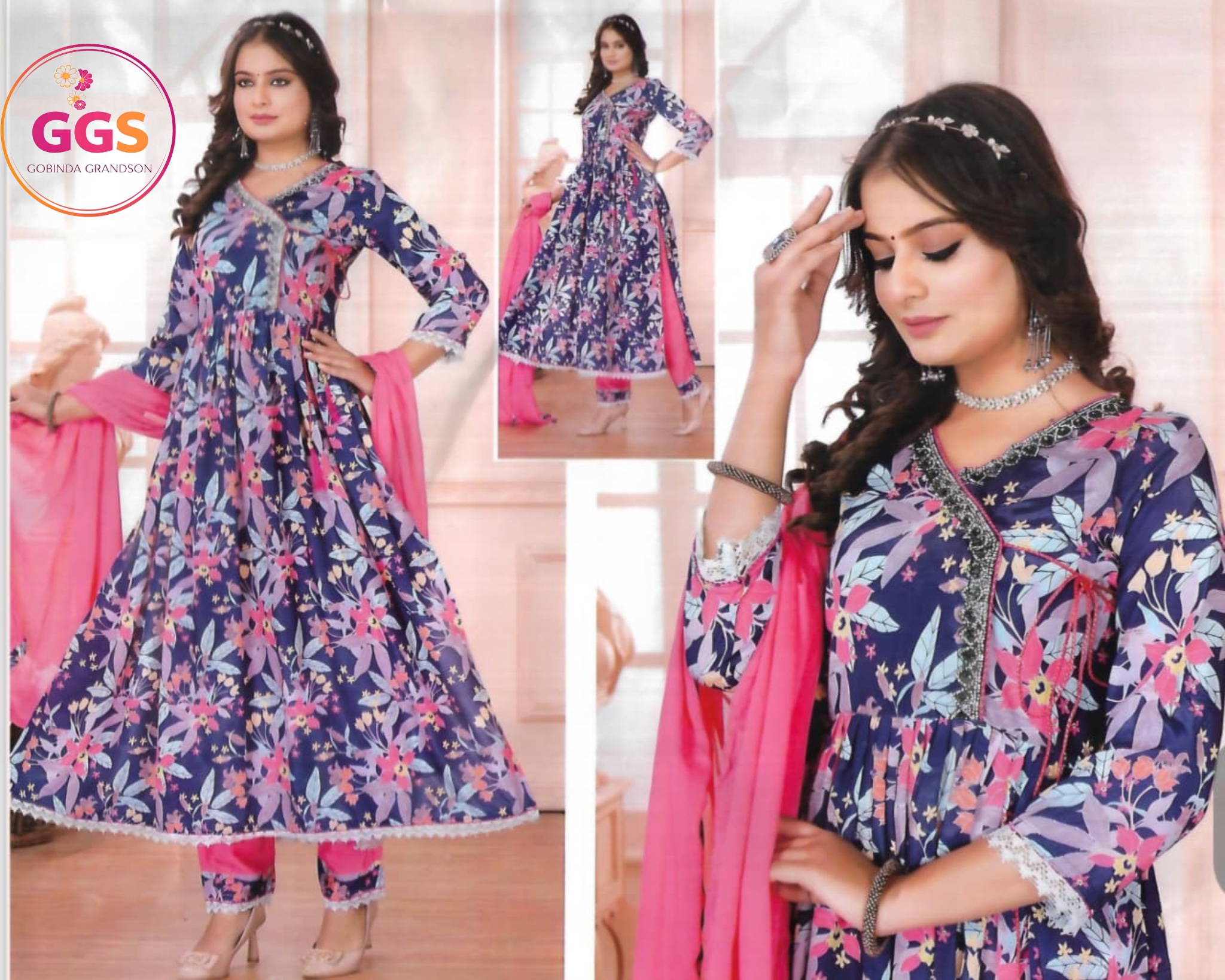 The set includes a stylish Anarkali kurta, matching pants, and a soft contrasting dupatta, creating a graceful and complete ethnic look. The breathable cotton fabric ensures comfort throughout the day, making it suitable for daily wear, family gatherings, festive occasions, or casual outings.