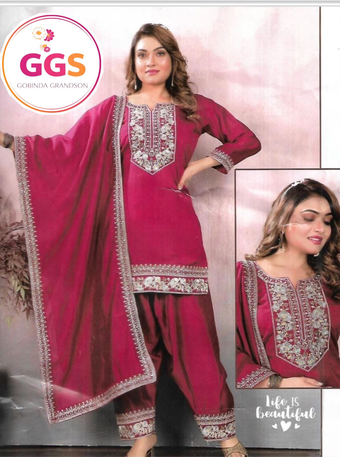 The set includes a beautifully embroidered kurta, matching bottom, and a stylish dupatta, making it a perfect outfit for festive celebrations, family functions, and traditional occasions.