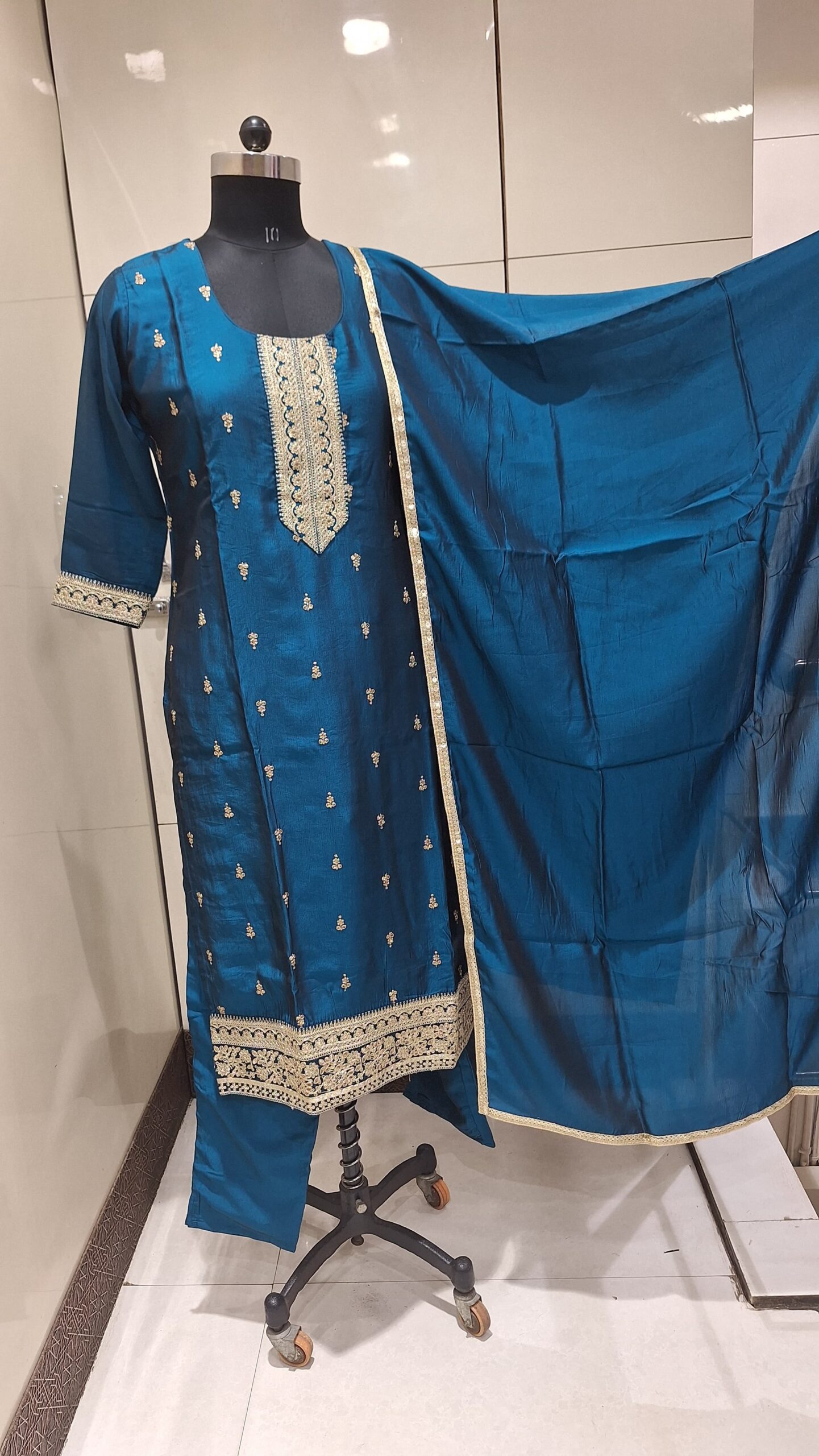 This elegant ethnic 3-piece set includes a beautifully embroidered kurta, matching bottom and a soft dupatta. Designed for comfort and festive styling, it offers a premium look for celebrations and occasions.